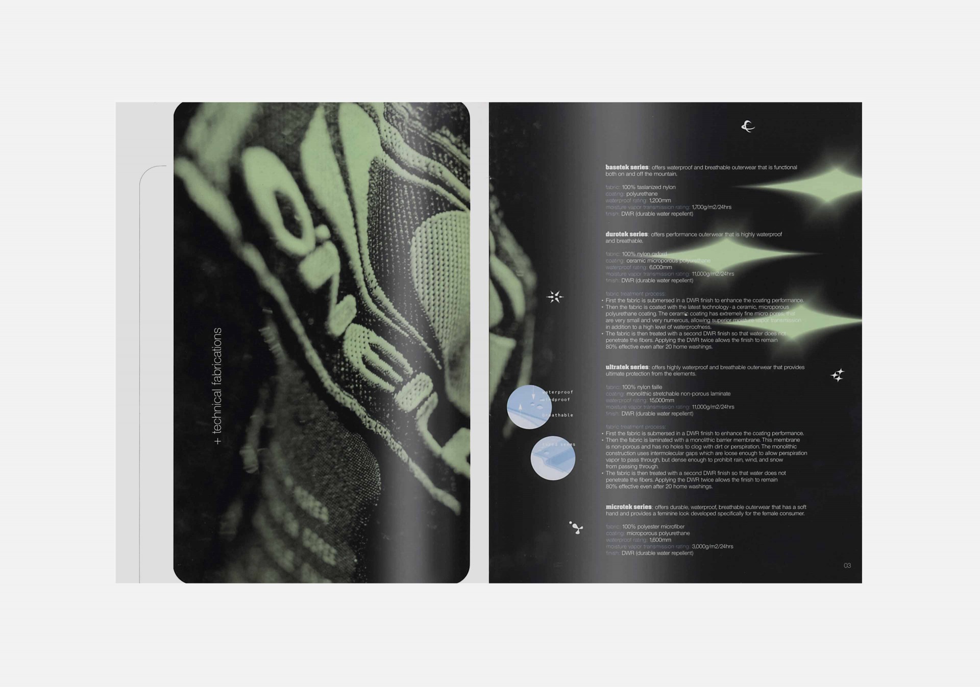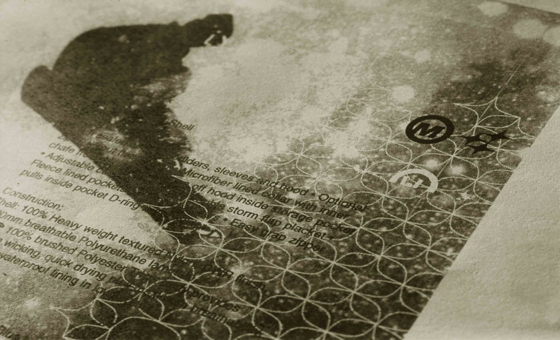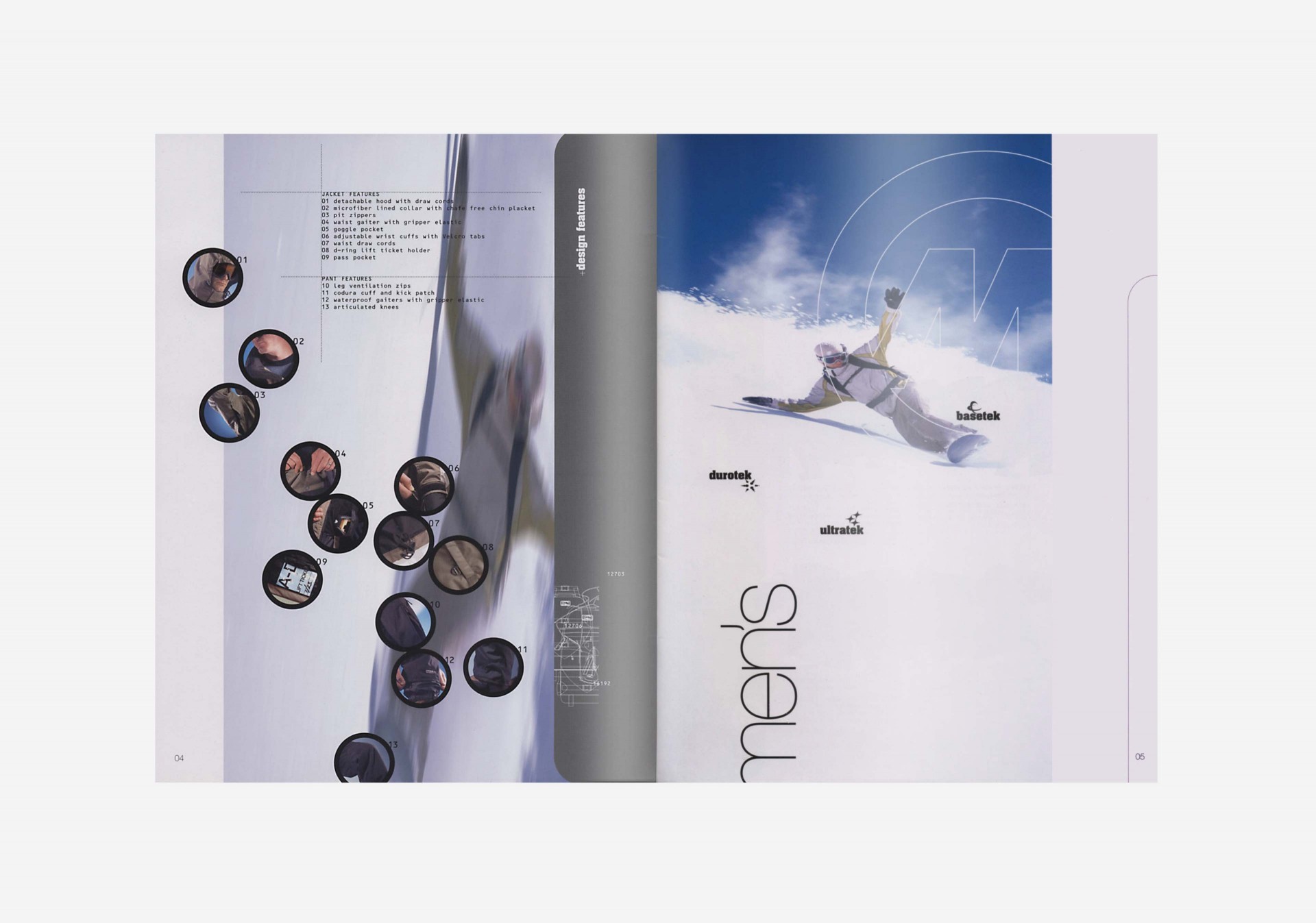 O’Neill’s snowboard catalog design featured an apparel line with four technical fabrication characteristics designed for protection against the elements. Sub brand identity icons were developed for each technical benefit: insulation, breathable, windproof and waterproof.